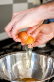 Bliskie zdjęcie ręki dziewczyny, która zrzuca żółtko organicznego jajka do miski ze stali nierdzewnej w kuchni. Spadające żółtko.