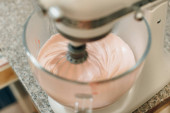 Zdjęcie "Bliskie zdjęcie miksera trzepaczka, która miesza bezy w misce zupy ze stali nierdzewnej w kuchni." może być wykorzystywane do celów osobistych i komercyjnych zgodnie z warunkami zakupionej licencji Royalty-free. Obraz jest dostępny do pobrania w jakości wysokiej rozdzielczości do 5760x3840.