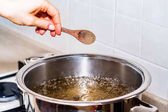 Bliskie zdjęcie ręki kobiety, która przygotowuje się do nalewania śmietanki z kubka do rondla z sokiem cytrynowym i żądzą na gazowym piecu