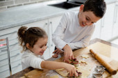 Dzieci kroją ciasteczka z ciasta. Brat i jego siostra gotują ciasteczka w domu.
