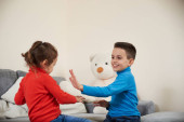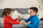 Zdjęcie "Chłopiec i dziewczyna uśmiechają się do siebie. Dzieci gotują w kuchni.." może być wykorzystywane do celów osobistych i komercyjnych zgodnie z warunkami zakupionej licencji Royalty-free. Obraz jest dostępny do pobrania w jakości wysokiej rozdzielczości do 5760x3840.