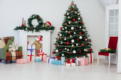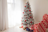 Nowy Rok karty wnętrza brązowy wystrój i choinka z prezentami