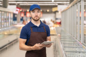Młody człowiek w mundurze pracujący jako merchandiser w nowoczesnym supermarkecie przy użyciu tabletu cyfrowego, poziome średnie ujęcie