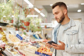 Zdjęcie "Młody człowiek w mundurze pracujący jako merchandiser w nowoczesnym supermarkecie przy użyciu tabletu cyfrowego, poziome średnie ujęcie" może być wykorzystywane do celów osobistych i komercyjnych zgodnie z warunkami zakupionej licencji Royalty-free. Obraz jest dostępny do pobrania w jakości wysokiej rozdzielczości do 5760x3840.