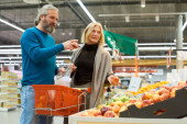 Atrakcyjna młoda kobieta ubrana w luźne ubrania stojąca z wózkiem sklepowym w przejściu sklepowym
