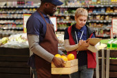 Zdjęcie "Współczesny pracownik supermarketu sprzedający świeże warzywa nierozpoznawalnej kobiecie" może być wykorzystywane do celów osobistych i komercyjnych zgodnie z warunkami zakupionej licencji Royalty-free. Obraz jest dostępny do pobrania w jakości wysokiej rozdzielczości do 5760x3840.
