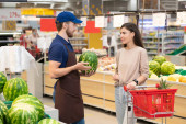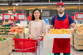 Portret młodej dorosłej kobiety stojącej w supermarkecie z koszykiem z wyborem słodkiej papryki