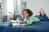 Zdjęcie "Młody mieszane wyścigu współczesny student siedzi na łóżku przed otwartymi książkami i fotografowania stron z tekstem na aparacie smartfona" może być wykorzystywane do celów osobistych i komercyjnych zgodnie z warunkami zakupionej licencji Royalty-free. Obraz jest dostępny do pobrania w jakości wysokiej rozdzielczości do 5760x3840.