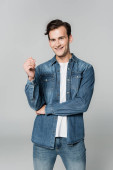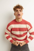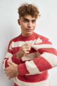 szczęśliwy młody człowiek w bordowy sweter golfowy pozowanie odizolowany na szary