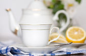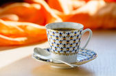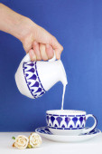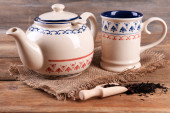 Hot latte coffee on a wooden white table, on the background (out of focus) a ceramic jar
