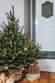 Stylowa kompozycja świąteczna we wnętrzu salonu z białym kominem, choinką i wieńcem, gwiazdami, prezentami i dekoracją. Nadchodzi klauzula Świętego Mikołaja. Wzór.