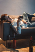sfrustrowany mężczyzna leżący na kanapie obok butelek z napojami alkoholowymi na stole w domu