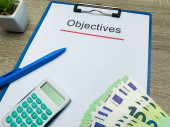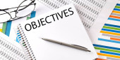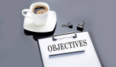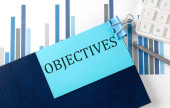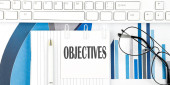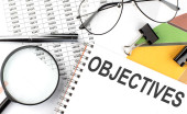 Widok z góry, długopis, okulary, kalkulator i notatnik napisane OBJEKTYWY na szarym tle.
