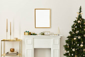 Kompozycja świąteczna na białym kominie we wnętrzu salonu z piękną dekoracją. Choinka i wieniec, świece, gwiazdy, światło. Odbiór. Wzór.