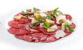 Cielęcina carpaccio z parmezanem, rukolą i grzybami. Na białym talerzu i jasnym tle