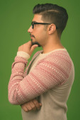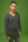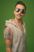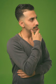 młody przystojny Irańczyk z wąsami na zielonym tle