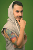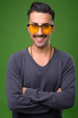 młody przystojny Irańczyk z wąsami na zielonym tle