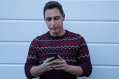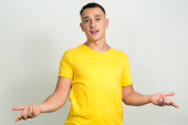 Zdjęcie "Studio strzał szczęśliwy młody przystojny mężczyzna uśmiecha się podczas patrząc zaskoczony i za pomocą telefonu komórkowego na białym tle" może być wykorzystywane do celów osobistych i komercyjnych zgodnie z warunkami zakupionej licencji Royalty-free. Obraz jest dostępny do pobrania w jakości wysokiej rozdzielczości do 5760x3840.