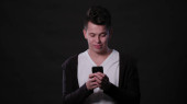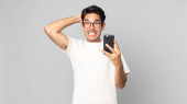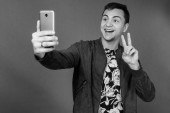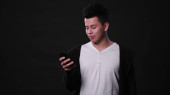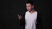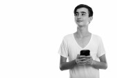 Studio strzał szczęśliwy młody przystojny mężczyzna uśmiecha się podczas patrząc zaskoczony i za pomocą telefonu komórkowego na białym tle