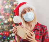 Młoda kobieta w masce i świątecznym kapeluszu na żółtym tle