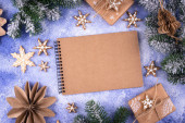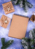 Boże Narodzenie lub Nowy Rok tle z otwartym pustym notatnikiem, gałązki świerku i Boże Narodzenie ekologiczne drewniane dekoracje. Listę kontrolną albo list do Mikołaja. Wizytówka świąteczna. Przestrzeń chroniona