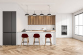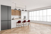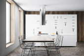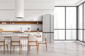 Zdjęcie "Wnętrze nowoczesnej kuchni z białymi ścianami, drewnianą podłogą, białymi szafkami i stołem jadalnym. 3d renderowanie" może być wykorzystywane do celów osobistych i komercyjnych zgodnie z warunkami zakupionej licencji Royalty-free. Obraz jest dostępny do pobrania w jakości wysokiej rozdzielczości do 5760x3840.