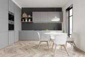 Wnętrze nowoczesnej kuchni z białymi ścianami, drewnianą podłogą, białymi szafkami i stołem jadalnym. 3d renderowanie