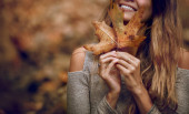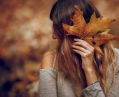 Portret pięknej dziewczyny bawiącej się w jesiennym lesie. Trzymanie suchego liścia klonu. Piękno jesiennego sezonu