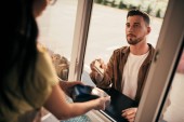 Młody biznesmen kupujący narkotyki w aptece lub aptece, podczas gdy atrakcyjna farmaceutka pracuje w tle.