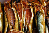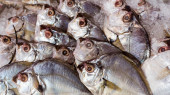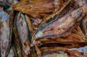 Daing na sprzedaż w lokalnym sklepie z suszonymi rybami w Divisoria, Manila, Filipiny. Ryby są podzielone i wysuszone..
