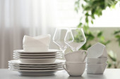 Zestaw czystych naczyń, sztućców i kieliszków do szampana na stole w pomieszczeniu