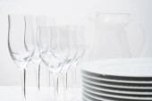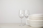 Zestaw czystych naczyń i kieliszków do wina na białym stole wewnątrz