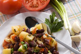 Sałatka pomidorowo-zielona z anchois i oliwkami z bliska w misce na stole. Horyzont