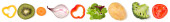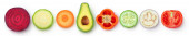 Zbiór owoców i warzyw izolowanych na białym tle. Świeża żywność w plasterkach