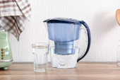 Filtr wody pitchera na stole kuchennym. Renderowanie 3D