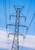 wysokiego napięcia linii metalowe podpory nad jasne bezchmurne niebo niebieskie