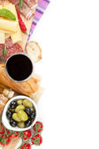 czerwone wino z ser, szynka, chleb, warzywa i przyprawy