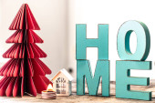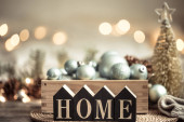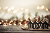 Przytulne tło z drewnianym słowem domu i dekoracji domu szczegóły na rozmytym tle z bokeh.