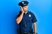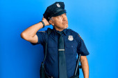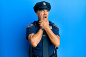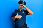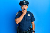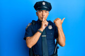 Przystojny mężczyzna w średnim wieku, ubrany w policyjny mundur, proszący o ciszę z palcem na ustach wskazującym ręką na bok. cisza i tajne pojęcie.