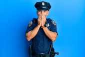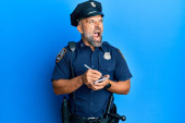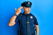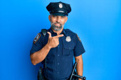 Zdjęcie "Przystojny mężczyzna w średnim wieku, ubrany w policyjny mundur, proszący o ciszę z palcem na ustach wskazującym ręką na bok. cisza i tajne pojęcie. " może być wykorzystywane do celów osobistych i komercyjnych zgodnie z warunkami zakupionej licencji Royalty-free. Obraz jest dostępny do pobrania w jakości wysokiej rozdzielczości do 5760x3840.