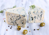 smaczny ser pleśniowy z oliwek, na drewnianym stole
