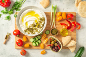 Zdjęcie "Popularne środkowo-wschodnie przystawki labneh lub labaneh, miękki biały kozi ser mleczny z oliwą z oliwek, hizop lub zaatar, podawane z chlebem pita na szary stół, flaylay." może być wykorzystywane do celów osobistych i komercyjnych zgodnie z warunkami zakupionej licencji Royalty-free. Obraz jest dostępny do pobrania w jakości wysokiej rozdzielczości do 5760x3840.