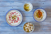 Popularne środkowo-wschodnie przystawki labneh lub labaneh, miękki biały kozi ser mleczny z oliwą z oliwek, hizop lub zaatar, podawane z chlebem pita na szary stół, flaylay.
