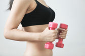 dziewczynka młody piękny fitness ćwiczenia z hantlami, szczegół, na jasnoszarym tle