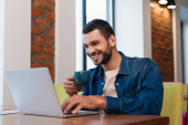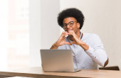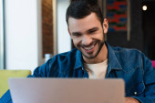 szczęśliwy african amerykański człowiek w bezprzewodowy słuchawki podcast słuchów w pobliżu laptopa na biurku