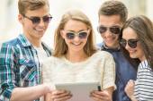 Czterech biznesmenów siedzi na ławce w letnim mieście