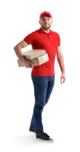 Portret uśmiechniętego mężczyzny w mundurze trzymającego schowek na białym tle
