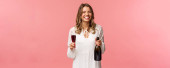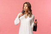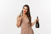 Koncepcja świąt zimowych. Wizerunek szczęśliwej młodej kobiety w luksusowej sukience, pijącej szampana ze szkła, trzymającej butelkę, imprezy noworocznej, białe tło