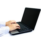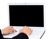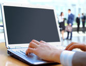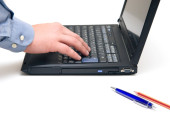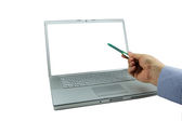 bliska ludzkiej ręki, z piórem w laptopy wyświetlania