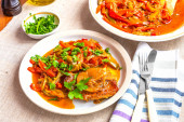 Gotowanie sosu z kurczaka toskańskiego - smażenie cebuli z suszonymi pomidorami, pastą pomidorową, szpinakiem i śmietaną na patelni.